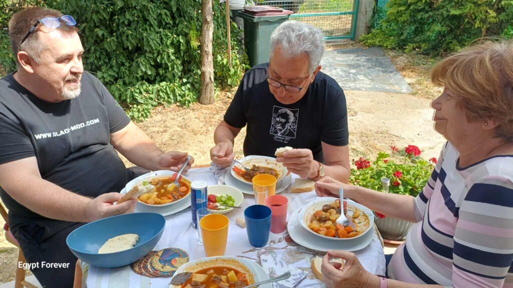 Csapatunk nemcsak a bográcskodásban jártas, hanem a sivatagi túrázásban, a piramisokba leereszkedésben, ősi templomok felfedezésében is. Hiszen legutóbb áprilisban, a Siwa-oázisban kalandoztunk együtt, ahol a datolyapálmák árnyékában és a homokdűnék ölelésében töltöttük a napokat. Az ottani élmények most újra előkerültek: mindenki sztorizott, emlékezett, nevetett még akár némi öniróniával a saját vagy egymás galádságain is. Hiszen ez a baráti társaság íratlan szabálya. Hogy tudjunk nevetni együtt, jó emlékeken őszinte örömmel.