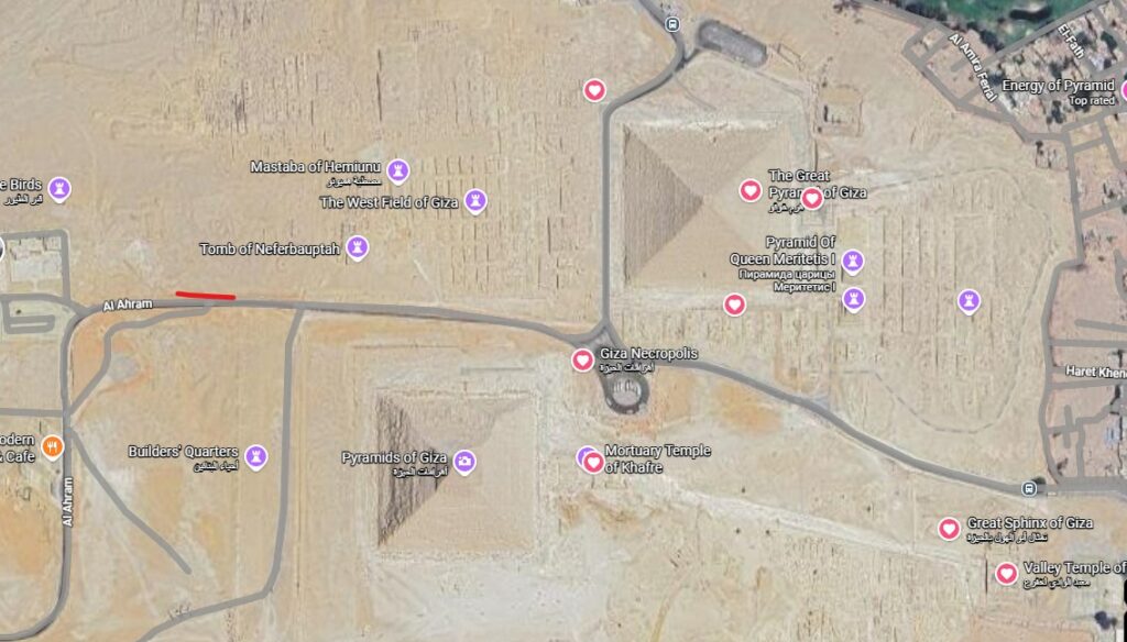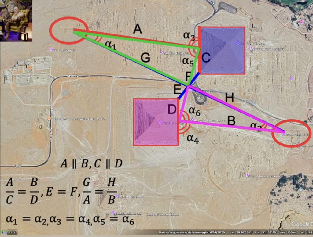 Biondi azt állítja, hogy erős, pontos szimmetria van: egy vonal a Khafre-piramistól a Szfinxig, és egy tükrözött vonal a Nagy Piramistól a feltételezett második Szfinx helyszínéig.