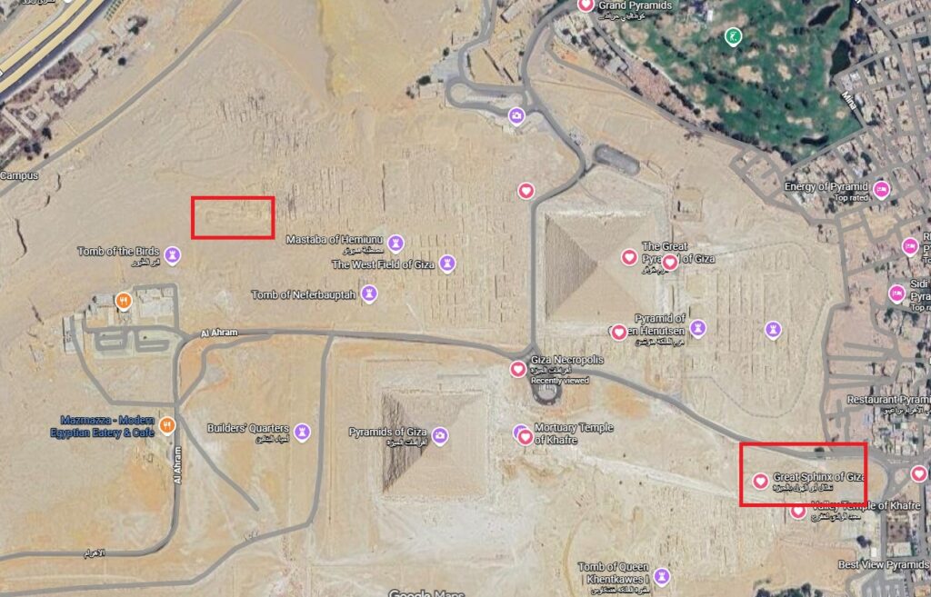 Amikor egyenes vonalakat húztak a piramisoktól a meglévő Szfinxig, a geometria egy tükrözött pontra mutatott a másik oldalon, ahol a szkenneléseik arra utalnak, hogy egy nagy építmény van eltemetve egy körülbelül 33 méter magas, megkeményedett homokkupac alatt. Azt mondja, hogy a szkennelési adatokban látható formák nagyon hasonlítanak ahhoz, amit már találtak az ismert Szfinx alatt, beleértve a függőleges aknákat és a földalatti járatokat.