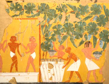 A falfestmény részlete az ókori Egyiptom borkészítési folyamatát ábrázolja. Nakht sírja (TT52). Abd el-Qurna sejk, Nyugat-Théba.
